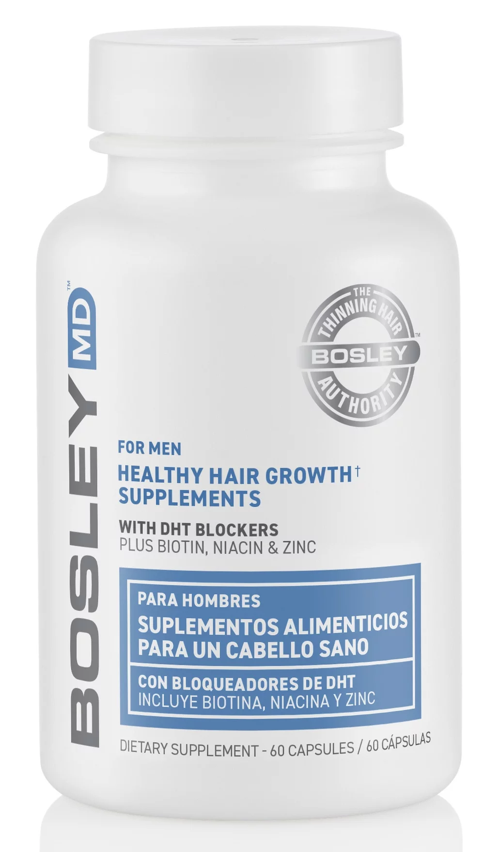 Добавка для здорового волосся для чоловіків допомагає боротися з випаданням волосся за допомогою рослин, що інгібує ДГТ, а також біотину, ніацину та цинку для більш густого та повного волосся. Біотин допомагає зміцнити волосяний фолікул, а ніацин і цинк підтримують здоров'я волосся і зменшують їх випадання. Екстракт гарбузового насіння, що входить до складу Bosley MD Healthy Hair Growth Capsules for Men, є натуральним інгредієнтом, що блокує ДГТ, багатий на вітаміни і мінерали.