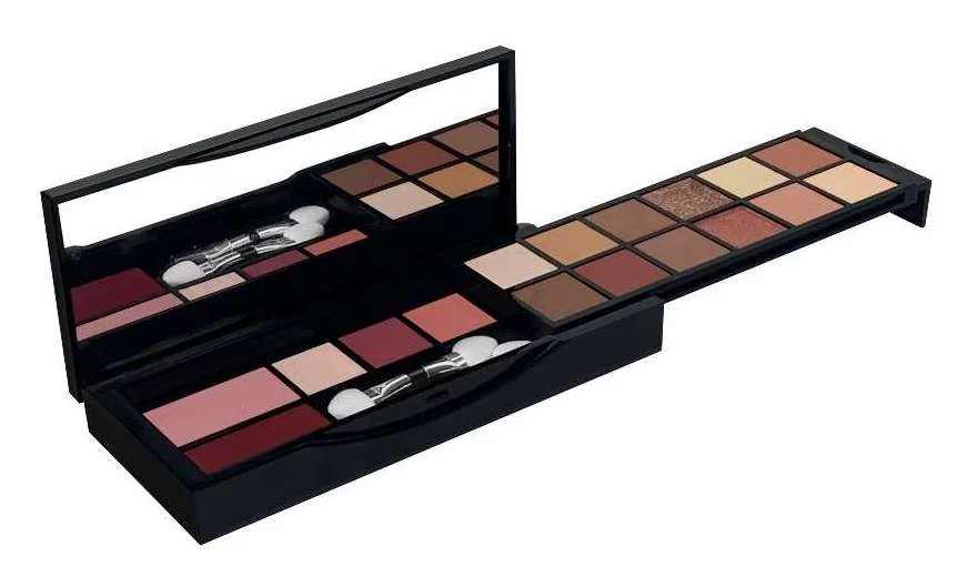 12 оттенков теней; 3 оттенка помады; 2 оттенка румян; 2 аппликатора.
