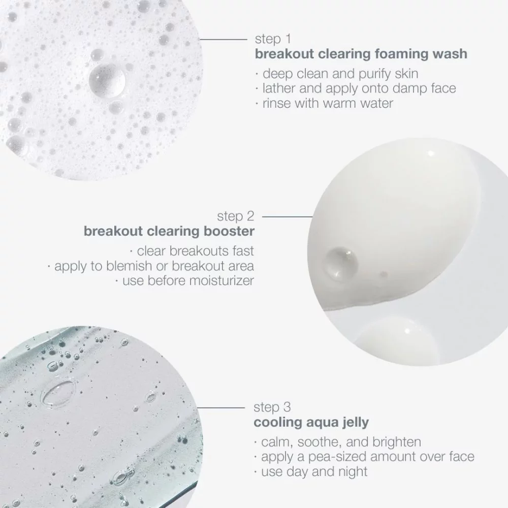 1. Breakout Clearing Foaming Wash – вспеньте небольшое количество геля на влажных ладонях и распределите по коже лица, шеи и груди, а также любых других зон, где кожа нуждается в активной очистке и борьбе с воспалениями. Избегайте нанесения на кожу вокруг глаз. Тщательно смойте теплой водой. Используйте утром и вечером.