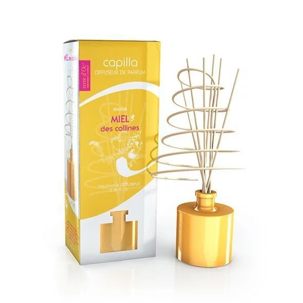 Органический интерьерный ароматизатор воздуха «Высокогорный мед» Terre d’Oc Fragrance Diffuser представляет собой набор из флакона с эфирными маслами и бамбуковых палочек. Он равномерно наполняет пространство ароматом цветущих полей и сладкого нектара, переносит на прогулку тропами пчеловода Жана Жоно, который расставил свои ульи на холмах среди дикой лаванды, там, где переплетаются запахи меда, воска, смолы и палящего солнца. Натуральный ароматизатор воздуха Terre d’Oc Fragrance Diffuser Honey from the Hills поможет создать атмосферу уюта и комфорта, подарит ощущение внутренней гармонии, снимет усталость и поднимет настроение. Кроме того, он эффективно нейтрализует неприятные запахи и гармонично дополнит любой интерьер. Секрет работы диффузора кроется в капиллярном строении бамбуковых палочек: парфюмированная жидкость наполняет помещение ароматом, поднимаясь из бутылочки до кончиков прутьев и испаряясь с их поверхности.