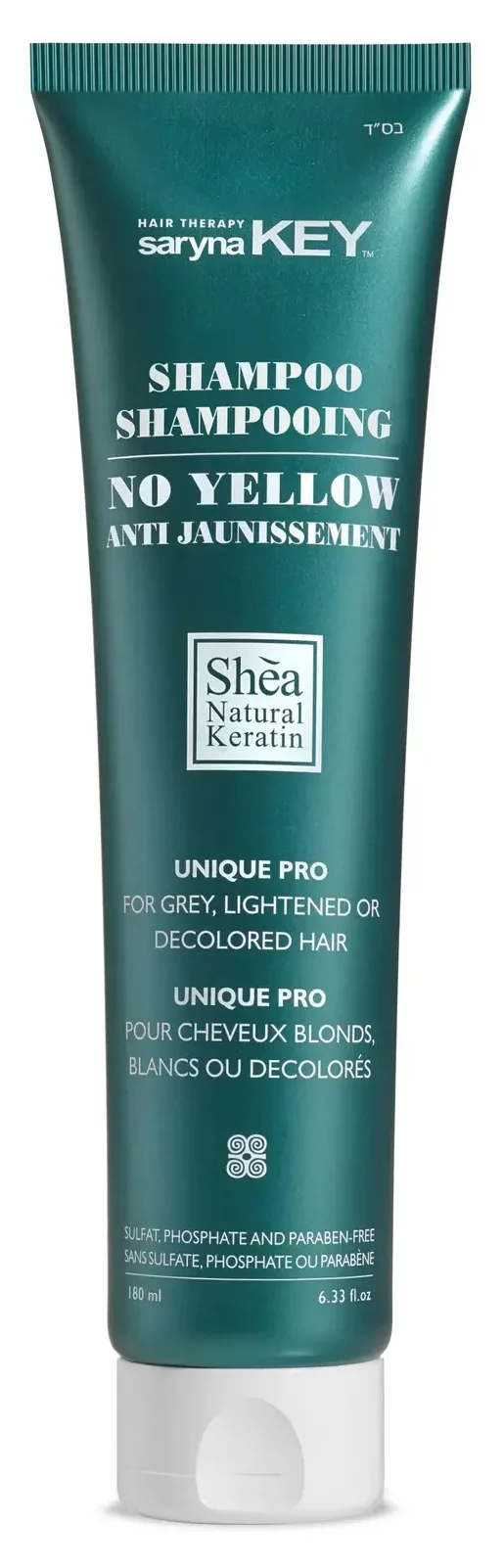 Шампунь Saryna Key Unique Pro No-Yellow - найновіша формула шампуню, що нейтралізує пігмент, з маслом Ши одночасно лікує і відновлює пошкоджене волосся. До складу засобу входять кератин, амінокислоти, вітаміни A, E та F, які разом із натуральним блакитним пігментом ідеально підходять для відновлення волосся та нейтралізації жовтого відтінку. Волосся стає м'яким, зволоженим і блискучим без жовтизни.