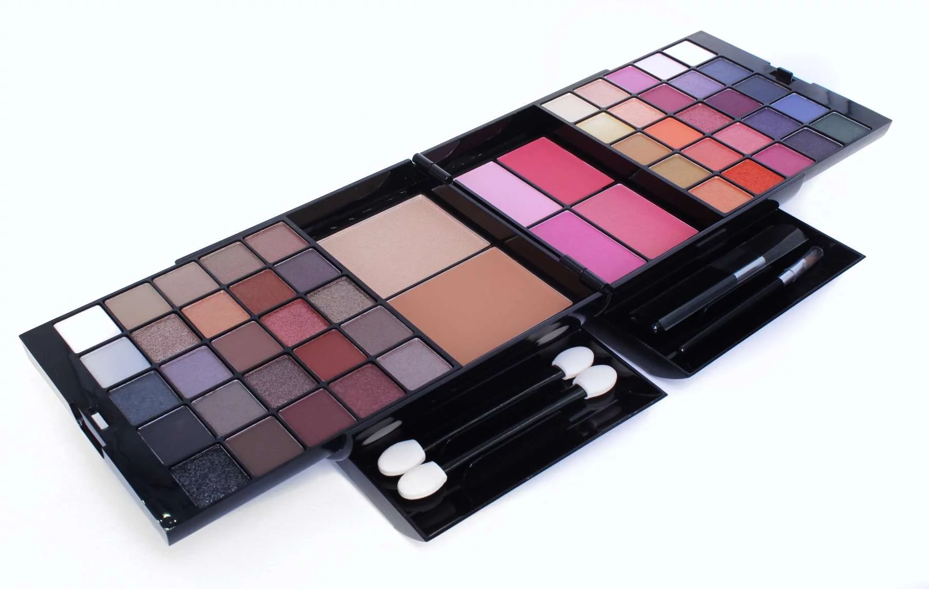 50 відтінків тіней; 2 відтінки пудри; 4 відтінки рум'ян; 2 аплікатори; 2 пензлі; косметичка.