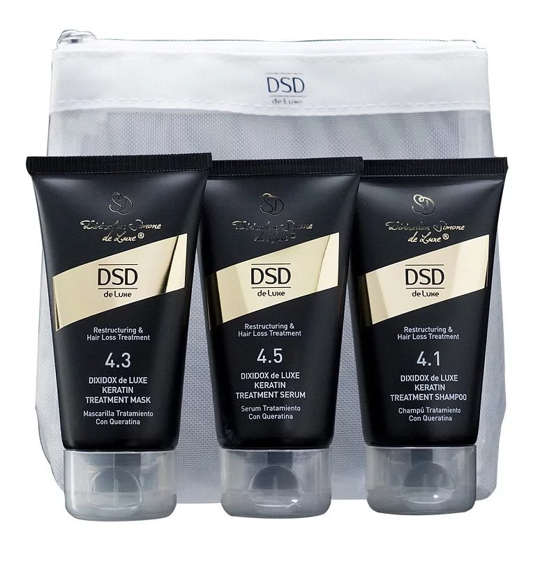 Склад набору: відновлюючий шампунь з кератином Диксидокс Де Люкс № 4.1 - Divination Simone De Luxe Dixidox DeLuxe Keratin Treatment Shampoo, 50ml + Відновлююча маска з кератином Dexіx DeLuxe Keratin Treatment Мask, 50ml + Сироватка збагачена кератином Диксидокс Де Люкс 4.5 - Divination Simone De Luxe Dixidox DeLuxe Keratin Treatment Serum, 50ml.